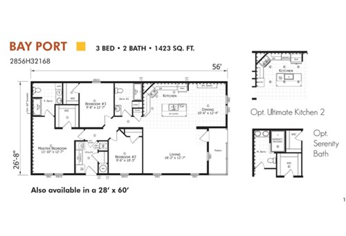 The Champion Homes Aspire Bay Port is a 3-bedroom, 2-bathroom manufactured home with a size of approximately 1,423 square feet. Key features include an open floor plan with a living room, dining room, and kitchen, a primary suite with a walk-in closet and large shower, granite countertops, and stainless steel appliances in the kitchen. It also comes with modern amenities like USB outlets, a built-in entertainment center, and a utility room with a folding table.