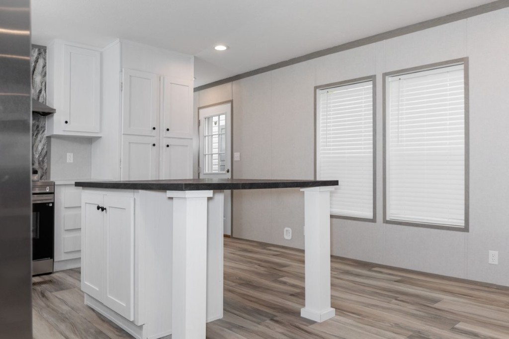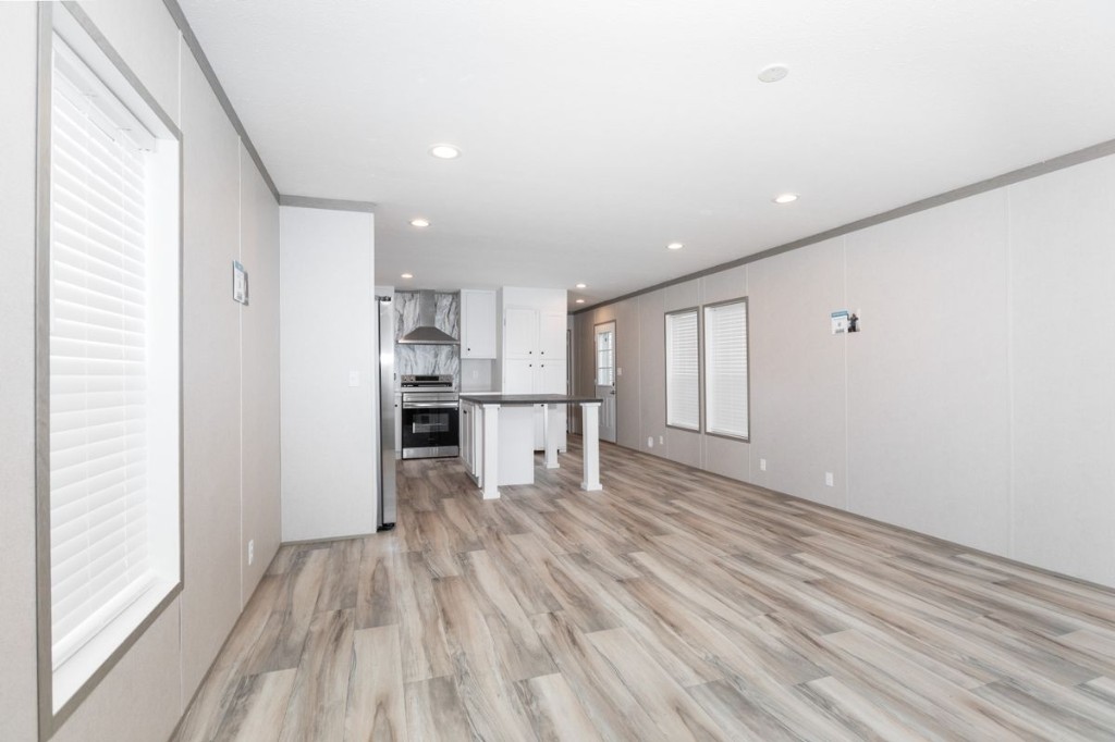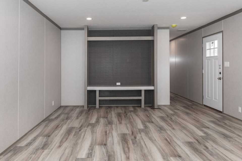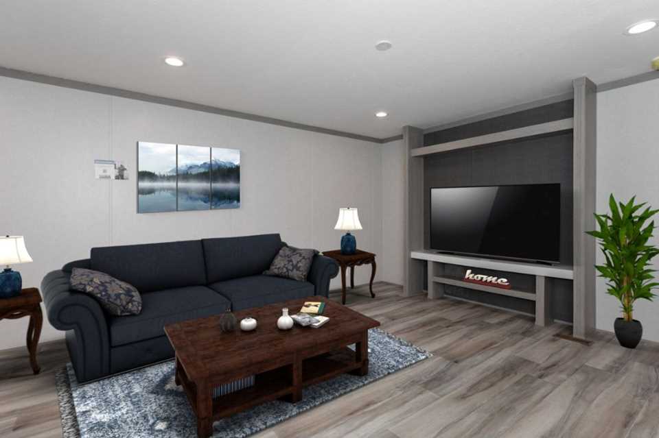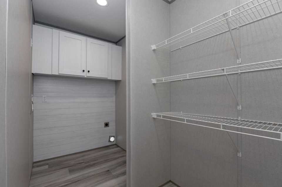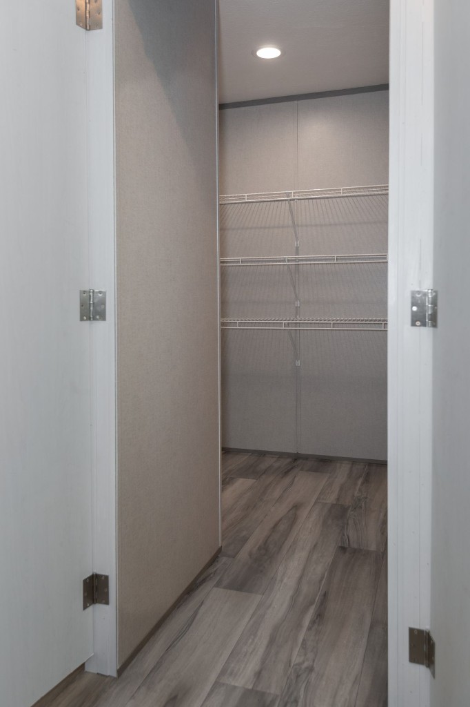 The Pantry House by Clayton Maynardville is a 1,165 sq. ft., 3-bedroom, 2-bathroom manufactured home designed for modern, efficient living. Featuring a 16x76 layout, it highlights a large kitchen with an island, a walk-in hidden pantry/laundry room, and an open floor plan, with rustic, modern finishes including barn doors and stainless steel appliances.